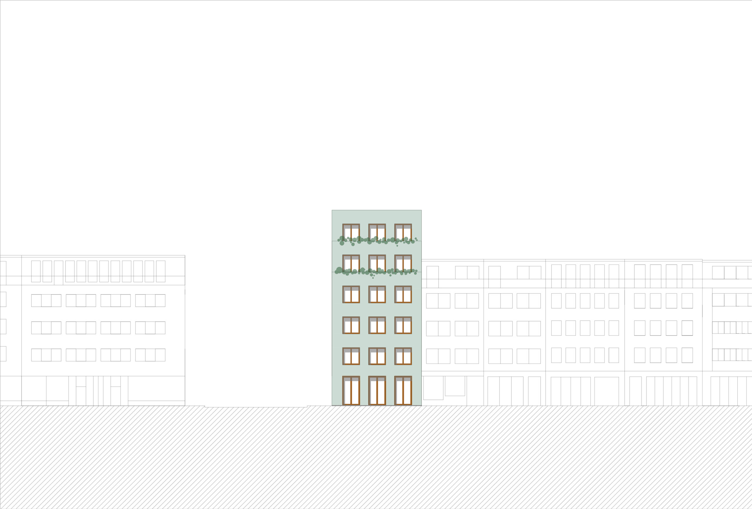 Wärme und Harmonie werden durch die Verwendung von Kirschholzfenstern und eine subtil grün verputzte Fassade ausgestrahlt. Großzügige Fensterfronten durchfluten die Büros und Wohnungen mit natürlichem Licht und schaffen eine Atmosphäre von Raum und Offenheit.