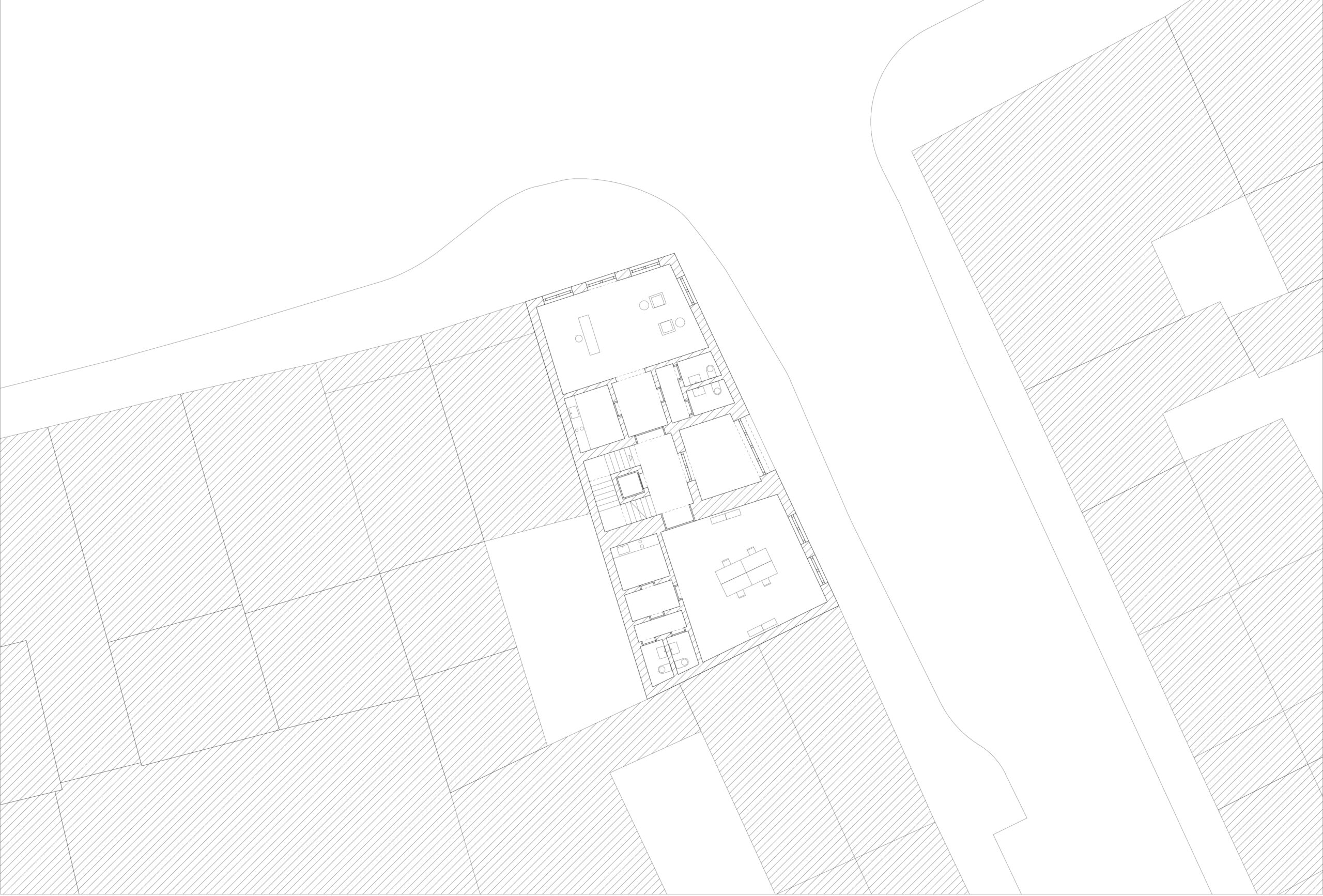 Das Erdgeschoss und das erste Obergeschoss bieten Platz für Büros, die darüber liegenden Etagen sind mit Wohnungen belegt, die sich terrassenförmig nach hinten versetzen. Zwei miteinander verbundene Baukörper, die im 90-Grad-Winkel zueinander stehen, bilden das Herzstück des Gebäudes.